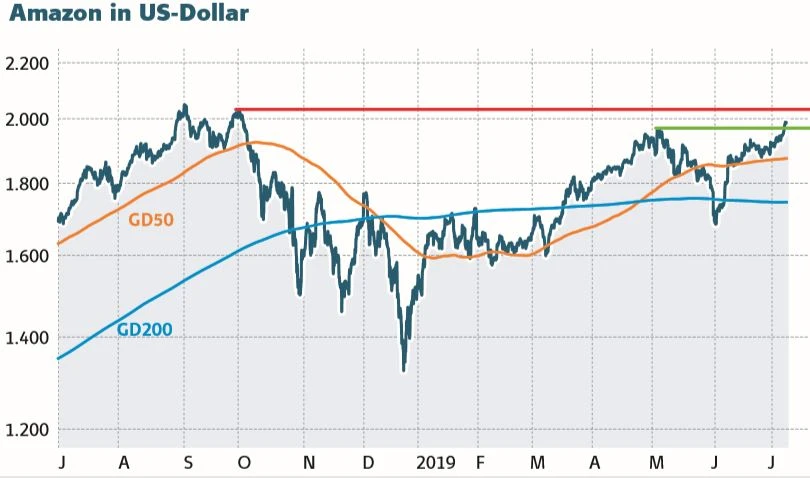 Es hatte sich seit Tagen angedeutet, nun ist es passiert: Die Amazon-Aktie hat am Dienstag kräftig Gas gegeben und mit Schwung den Widerstand bei 1.964 Dollar überwunden. Damit hat Amazon, falls sich der Break als nachhaltig erweist, ein ganz starkes Kaufsignal geliefert. Die Aktie könnte jetzt schnell auf ein neues Rekordhoch steigen.