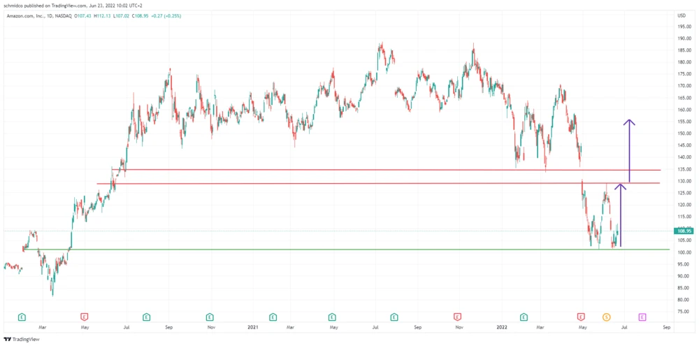 Ende April ließen enttäuschende Quartalszahlen die Amazon-Aktie bis an die 100-Dollar-Marke abstürzen. Dort setzte schließlich eine Gegenbewegung ein, die bei 128,99 Dollar ihren Höchststand erreichte, ehe es wieder zurück an die Unterstützung ging. In den vergangenen Tagen konnte die Aktie von Amazon aber wieder Boden gut machen.