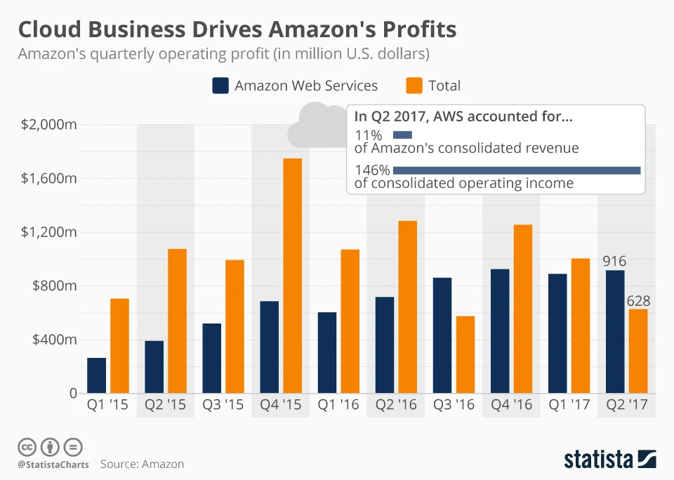 Anders als andere Einzelhändler hat Amazon dank des technologischen Know-Hows jedoch die Möglichkeit als Online-Werbeplattform, E-Commerce-Marktplatz, Video-Dienst oder Cloud-Anbieter Profite zu erzielen. So ist beispielsweise Amazon Web Service (AWS) bereits jetzt profitabler als das Kerngeschäft.