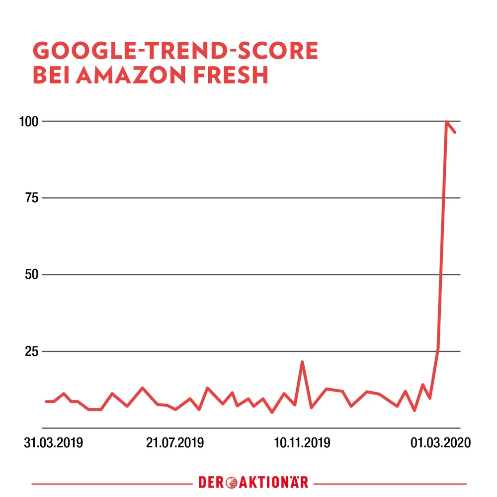 Das dürfte auch auf den Lebensmittelhandel zutreffen. Pure-Player wie Blue Apron und HelloFresh sind an der Börse derzeit ein heißes Thema. Und auch Amazon punktet mit seinem Lieferdienst Amazon Fresh: Die Google-Suche hat in den vergangenen Tagen stark zugenommen.