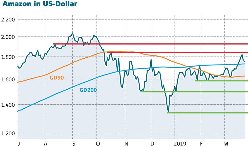 Folglich gibt die Amazon-Aktie im frühen US-Handel nach, verliert 0,5 Prozent auf 1,757 Dollar. Nachdem der Titel bereits am Freitag mit dem Gesamtmarkt unter Druck geraten war, hat sich das Chartbild nun eingetrübt. Es kann gut sein, dass die Aktie wieder unter die bedeutende 200-Tage-Linie rutscht, nachdem zuletzt ein mustergültiger Ausbruch gelungen war. Dieser könnte sich nun als nicht nachhaltig herausstellen.