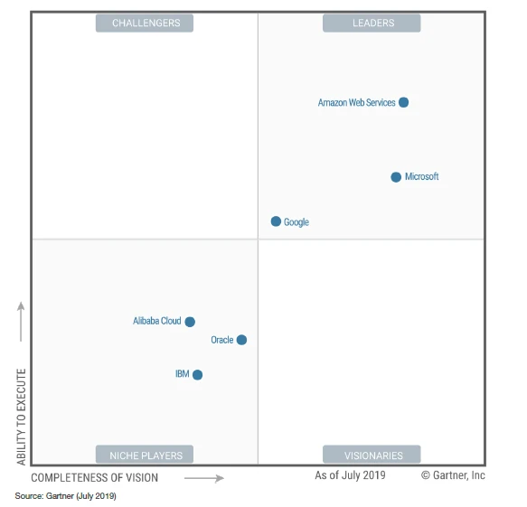 Auffällig ist auch der Abstand zu den anderen drei großen Anbietern Alibaba, IBM und Oracle. Sie werden im „Magic Quadrant“ als Nischenplayer geführt.