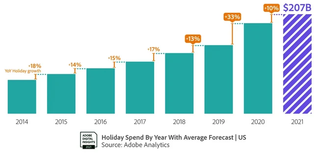Jedes Jahr liefert Adobe Analytics seine Prognosen zum US-Online-Shopping für die Vorweihnachtszeit – und am Mittwoch war es erneut soweit: Für die Monate November und Dezember wird ein Anstieg der Verkäufe um zehn Prozent auf 207 Milliarden Dollar erwartet.