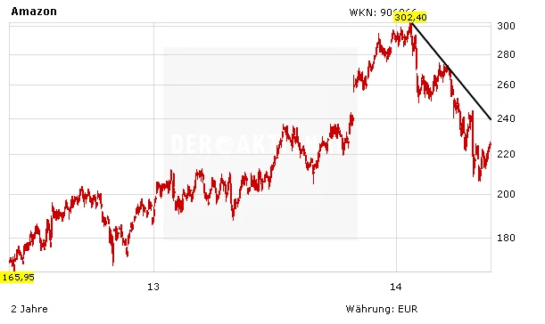 Nach ihrer jahrelangen Rekordfahrt hat die Aktie von Amazon zuletzt eine Verschnaufpause eingelegt. Seit Januar dieses Jahres hat sich ein Abwärtstrendkanal ausgebildet. Gelingt der Sprung über die obere Begrenzung, wäre dies als positives Signal zu werten. Anleger sichern ihre Position mit einem Stopp bei 190,00 Euro ab.