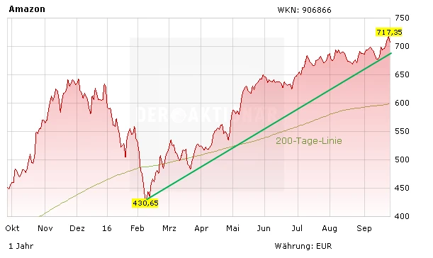 Bereits in der vergangenen Woche hat die Aktie von Amazon die 800-Dollar-Marke geknackt und am Freitag ein neues Allzeithoch bei 807,75 Dollar markiert. Derzeit notiert sie mit 805,75 Dollar leicht darunter. Kurzfristig kann es zu Gewinnmitnahmen kommen, langfristig ist der Aufwärtstrend aber weiter intakt. Investierte Anleger bleiben dabei und genießen das Kursspektakel.