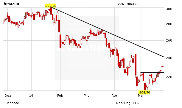 Die Aktie von Amazon wurde, zusammen mit etlichen anderen Momentum-Aktien, seit Anfang des Jahres regelrecht abgestraft. Zeitweise stand der Titel rund 30 Prozent unter dem Hoch vom letzten Dezember. Seit Mitte Mai zeigt das Papier nun erste Anzeichen einer Bodenbildung. Kürzlich konnte ein höheres Tief ausgebildet werden. Zusammen mit dem Überschreiten des Widerstands bei 223 Euro, hat sich damit das Chartbild wieder deutlich aufgehellt. Der nächste signifikante Widerstand liegt bei rund 240 Euro in Form der Abwärtstrendlinie. Um das Erholungsszenario nicht zu gefährden, soltle die Aktie nicht mehr unter die Marke von 211 Euro fallen.