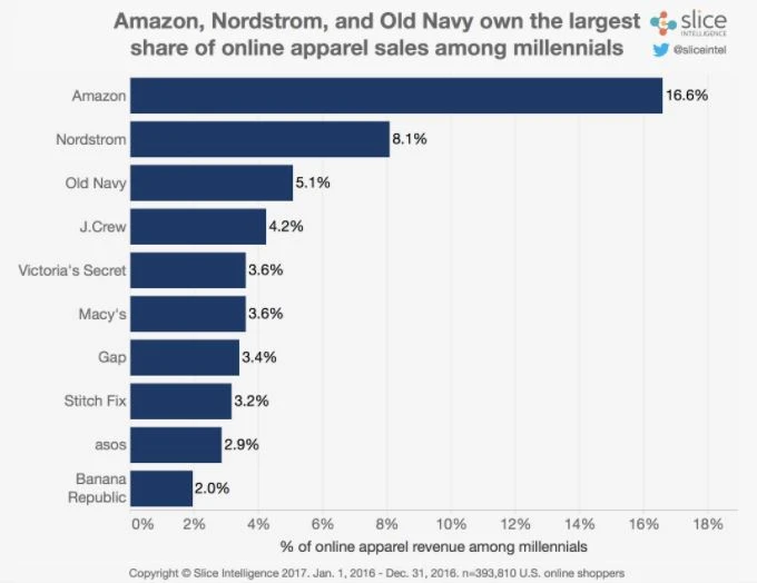 Amazons hoher Marktanteil ist keine Überraschung. Der Konzern entwickelt seit über einem Jahr eigene Marken (z.B. Franklin Tailored und Lark&Ro). In den USA verkauft Amazon mittlerweile eine Kollektion aus rund 1.800 Klamotten und Schuhen für Damen, Herren und Kinder. Die Lieferung erfolgt dank Prime kostenlos.