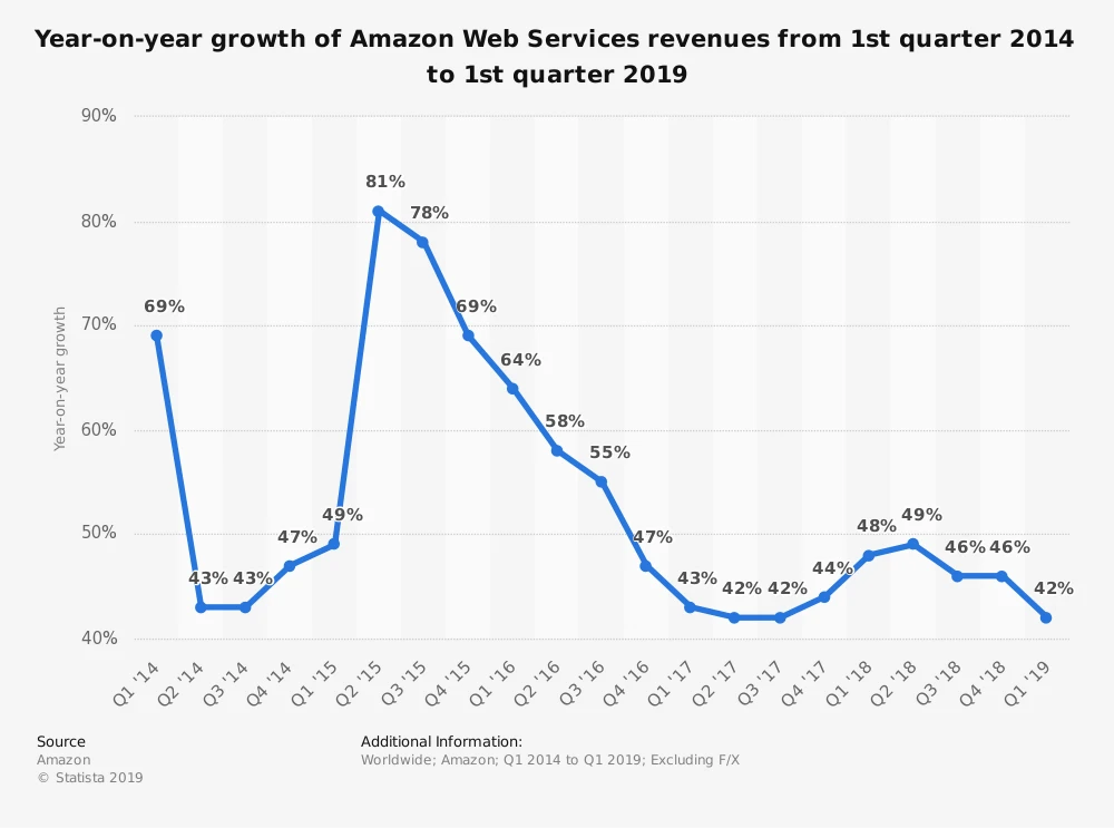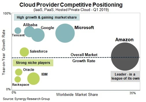 Die großen Verfolger Microsoft, Google und Alibaba holen jedoch langsam auf. Sie alle wuchsen im Q1 jenseits der 70-Prozent-Marke und entwickelten sich damit deutlich besser als der Gesamtmarkt.