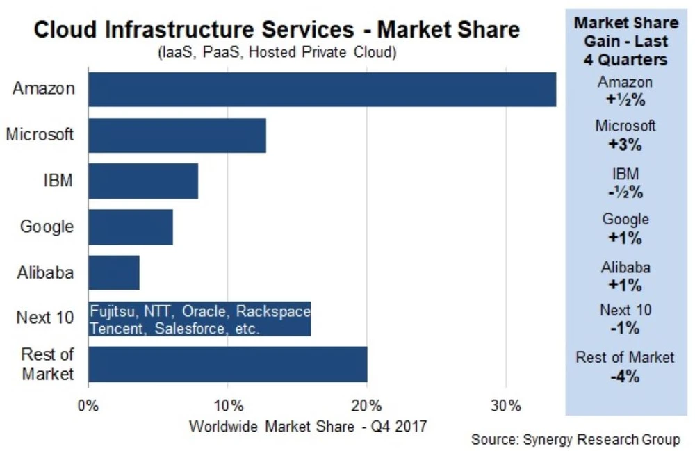 Im vierten Quartal 2017 stiegen die Ausgaben für die sogenannten Infrastruktur-Dienste um 46 Prozent im Vergleich zum Vorjahreszeitraum. Damit wächst der Markt im letzten Quartal stärker als im Rest des vergangenen Jahres. Insgesamt soll der Markt ein Volumen von über 13 Milliarden Dollar besitzen.