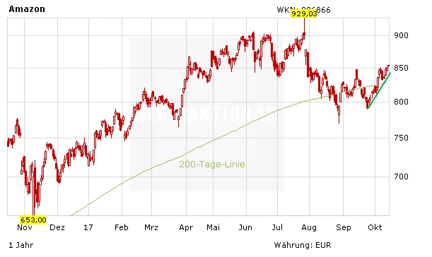 Positiv zu bewerten ist auch das Chartbild der Amazon-Aktie. Die 1.000-Dollar-Marke wurde geknackt, der seit Oktober anhaltende Aufwärtstrend beschleunigt sich. Beflügeln hier etwa bereits die Q3-Zahlen, die am 26.Oktober veröffentlicht werden? DER AKTIONÄR empfiehlt: Dabei bleiben!