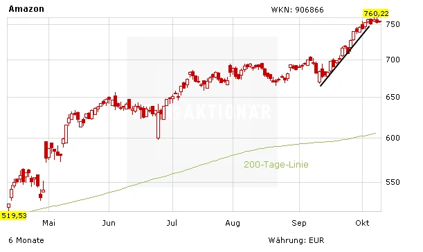 Für die Amazon-Aktie sieht es im Moment gut aus. Allein im September konnte das Papier um zehn Prozent zulegen. Seit Anfang Oktober bewegt sie sich seitwärts im Bereich des Allzeithochs von 760 Euro und nähert sich dem vom AKTIONÄR gesetzten Zielkurs. Der Stopp wird entsprechend auf 650 Euro nachgezogen.