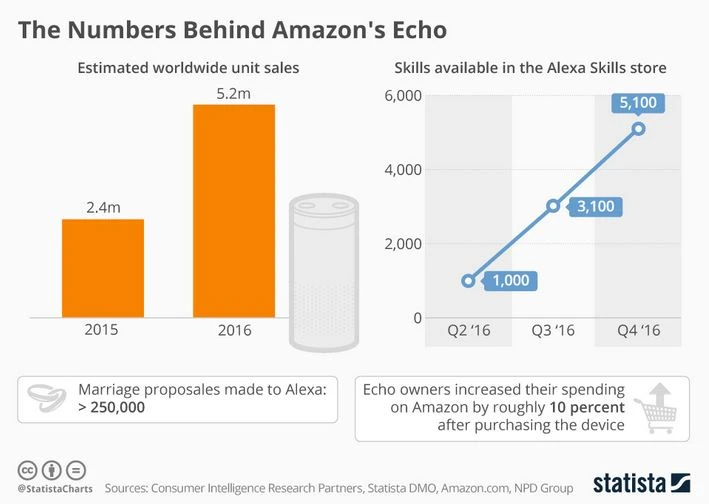 Wichtig für Amazon ist, dass dank der starken Echo-Verkäufe ein Vorsprung gegenüber der Konkurrenz wie Googles Home oder Apples Siri aufgebaut wird. Die reinen Verkaufserlöse des Echo von je 180 Euro bringen Amazon jedoch weniger Umsatz als das darin verbaute Sprachassistenz-System Alexa. Denn Echo-Nutzer bringen dreimal so hohe Erlöse wie ein Amazon-Kunde ohne den smarten Lautsprecher.