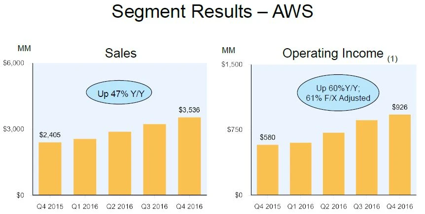 Ein weiterer Bereich, der über die vergangenen Quartale für rapiden Umsatz- und Profitzuwachs sorgte, ist Amazons Cloud Computing. Amazon Web Services (AWS) steigerte den Erlös im Vergleich zum vierten Quartal 2015 um 47 Prozent auf 3,5 Milliarden Dollar. AWS steuert zwar nur acht Prozent des Gesamtumsatzes bei, lieferte jedoch im vierten Quartal mit 926 Millionen Dollar satte 74 Prozent des operativen Ergebnisses von 1,2 Milliarden Dollar. Dennoch konnte auch das Cloud-Geschäft nicht mit den hohen Erwartungen der Analysten von 3,6 Milliarden Dollar Umsatz mithalten.