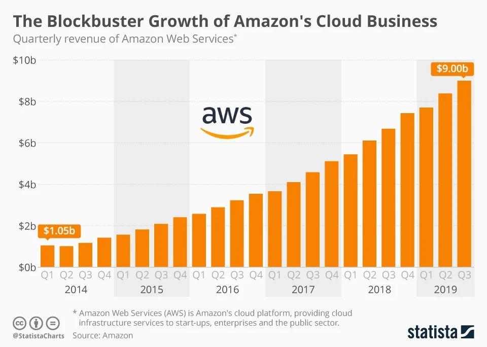 AWS erwirtschaftete im letzten Quartal rund neun Milliarden Dollar in der Cloud (siehe Grafik). Genaue Zahlen zu Azures Umsatzbeitrag werden seitens Microsoft nicht veröffentlicht. Experten schätzen den Anteil allerdings auf etwa 4,3 Milliarden Dollar.