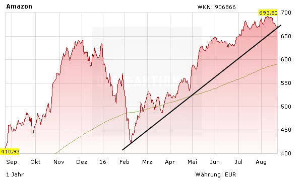 Die Amazon-Aktie hat vor wenigen Tagen ein neues Allzeithoch bei 698 Euro markiert. Seitdem befindet sich das Papier in einer durchaus wünschenswerten Konsolidierungbewegung. Wer noch nicht dabei ist, kann diesen Rücksetzer zum Kauf nutzen.