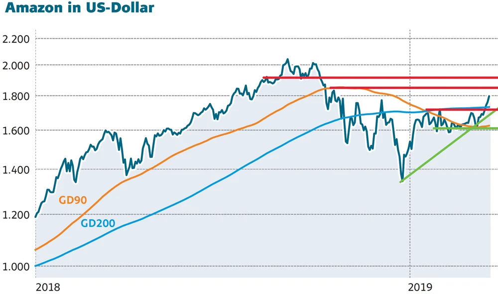 Es war nur eine Frage der Zeit, nun ist es so weit: das Break ist da. Nachdem die Amazon-Aktie Ende der vergangenen Woche bereits die psychologisch wichtige Marke von 1.700 Dollar geknackt hatte, gewann der Titel nun weiter an Momentum und überwand die bedeutende 200-Tage-Linie bei 1.710 Dollar. Darauf hatten die Bullen in Lauerstellung gewartet, nun griffen sie zu und katapultierten die Aktie auf 1.797 Dollar.