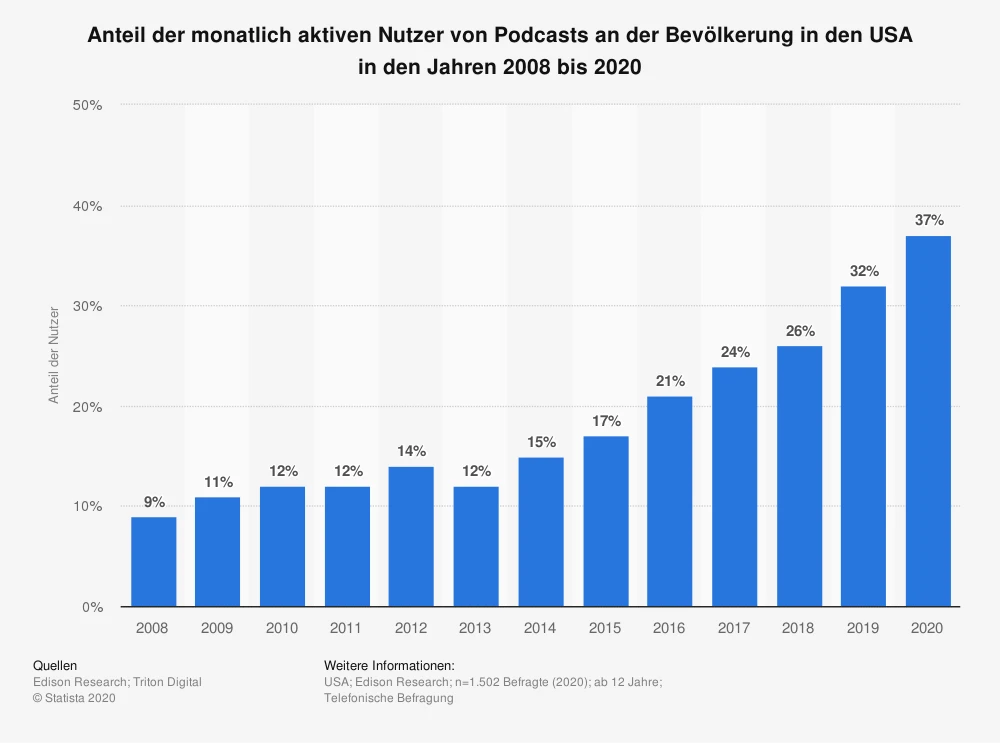Der Podcast-Markt in den USA wächst rasant und in nur fünf Jahren hat sich die Zahl der monatlichen aktiven Podcast-Hörer verdoppelt.