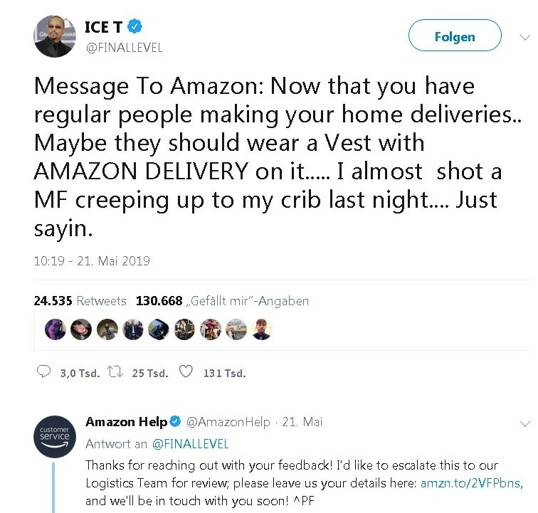 Rap-Legende Ice-T hat einen guten Rat für Amazon parat: nicht am falschen Ende sparen! Auf Twitter schrieb der 61-Jährige, er habe den Amazon-Boten für einen Einbrecher gehalten. „Ich habe den MF (Motherfucker) fast erschossen.“ Sein Tipp: „Spendiert euren Auslieferern doch Westen mit der Aufschrift Amazon Delivery.“