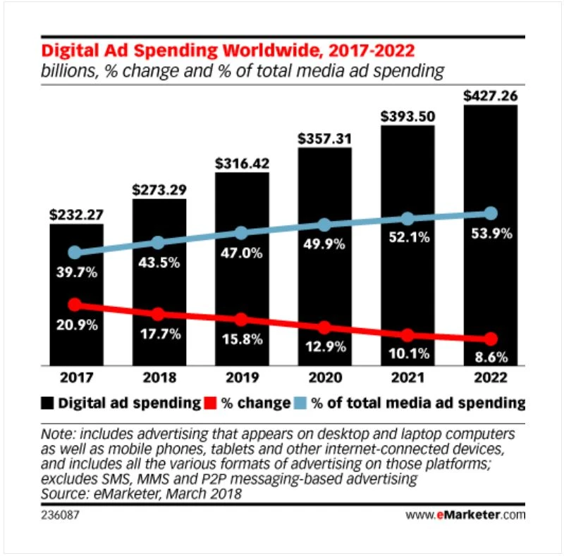 Der digitale Werbemarkt wächst – und zwar schnell. Laut den Marktforschern von EMarketer dürften im laufenden Jahr rund 273 Milliarden Dollar umgesetzt werden. Das sind knapp 18 Prozent mehr als im Vorjahr. Der Anteil der digitalen Werbung soll dabei in drei Jahren größer sein als der Anteil traditioneller Fernseh-, Radio- oder Printwerbung.
