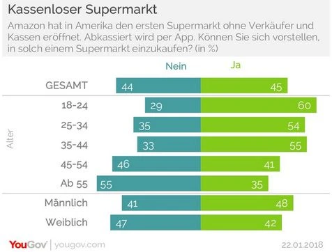 In der Tat zeigen sich gerade junge Menschen von dem Konzept angetan, wie eine Umfrage von YouGov vom Januar zeigt. Allerdings muss Amazon aufpassen, das Angebot nicht teurer zu machen als anderswo. 66 Prozent würden dann der Umfrage zufolge nicht bei Amazon Go einkaufen.