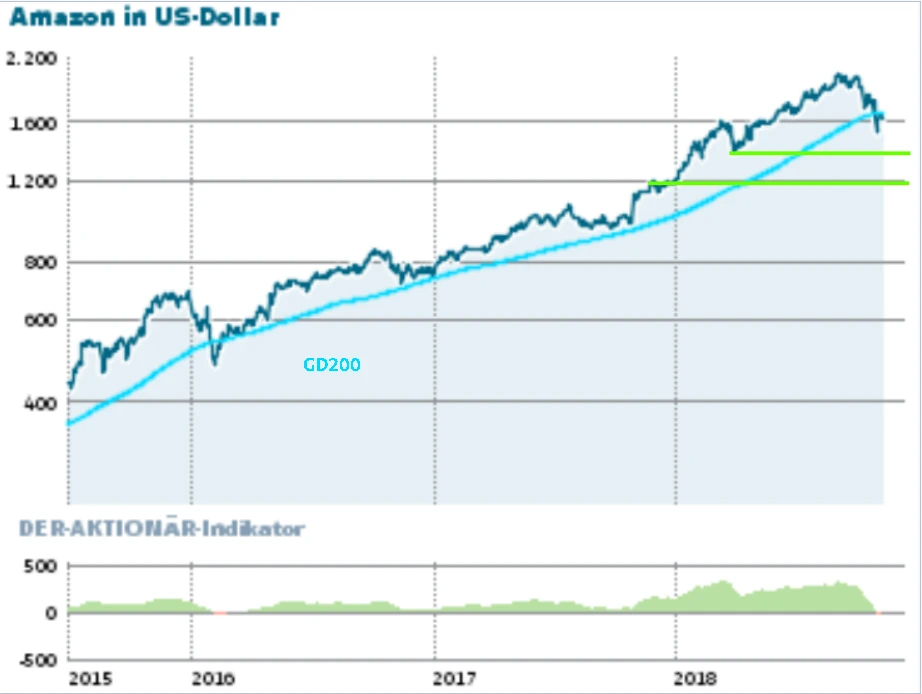 Unterdessen hat sich das Chartbild der Amazon-Aktie wieder eingetrübt. Am Montag ging es mit der Aktie 2,3 Prozent abwärts. Damit rutschte das Papier wieder unter die 200-Tage-Linie.