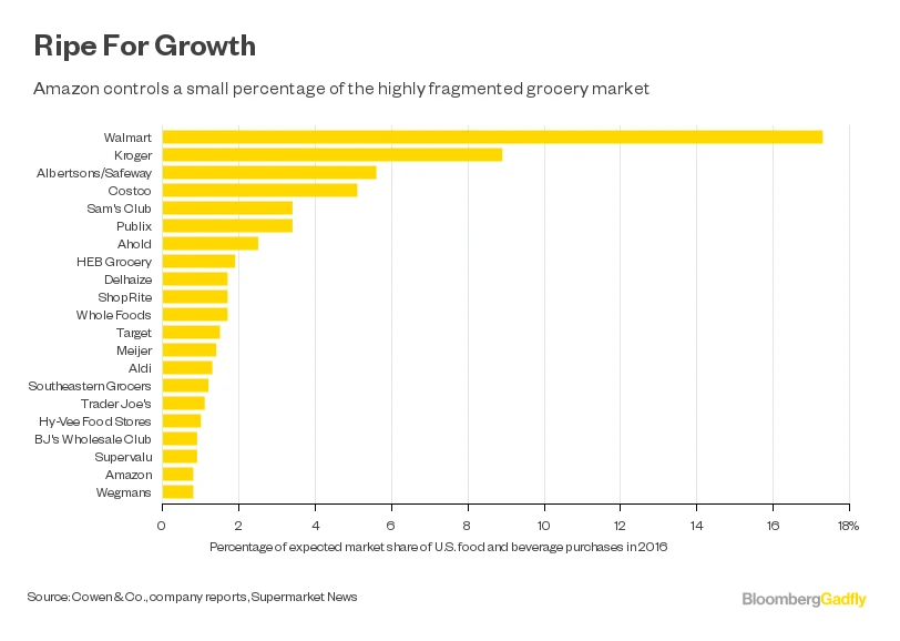 Vom gesamten 770 Milliarden Dollar Lebensmittelmarkt entfallen nur 0,8 Prozent auf Amazon. Zudem erfolgen nur zwei Prozent aller Lebensmittelverkäufe in den USA online. Um den Marktanteil schnell und in großem Umfang auszuweiten, könnte Amazon einen US-Lebensmittelhändler übernehmen. Spekuliert wird aktuell insbesondere um eine Übernahme der Einzelhändler Whole Foods und BJ´s Wholesale Club.