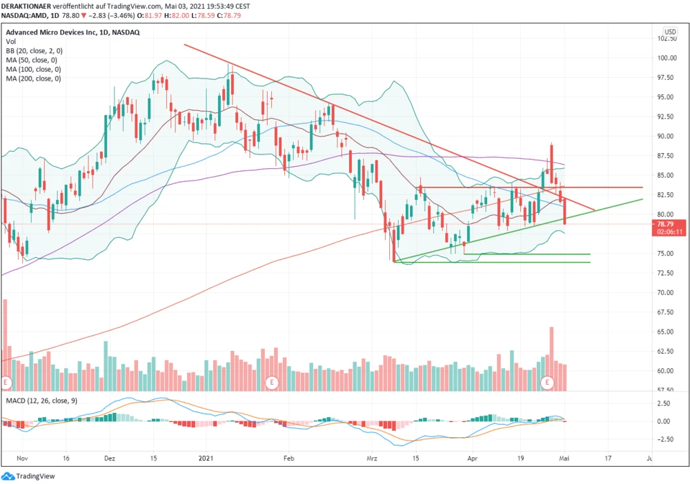 Am letzten Dienstagabend hat der US-Chiphersteller AMD seine Q1-Zahlen veröffentlicht. Diese lagen deutlich über den Erwartungen. Dennoch geriet die Aktie unter Druck. Bereits den fünften Tag in Folge steht der Wert nun deutlich im Minus. Des Weiteren könnte es noch heute zu einem neuen Verkaufssignal kommen.
