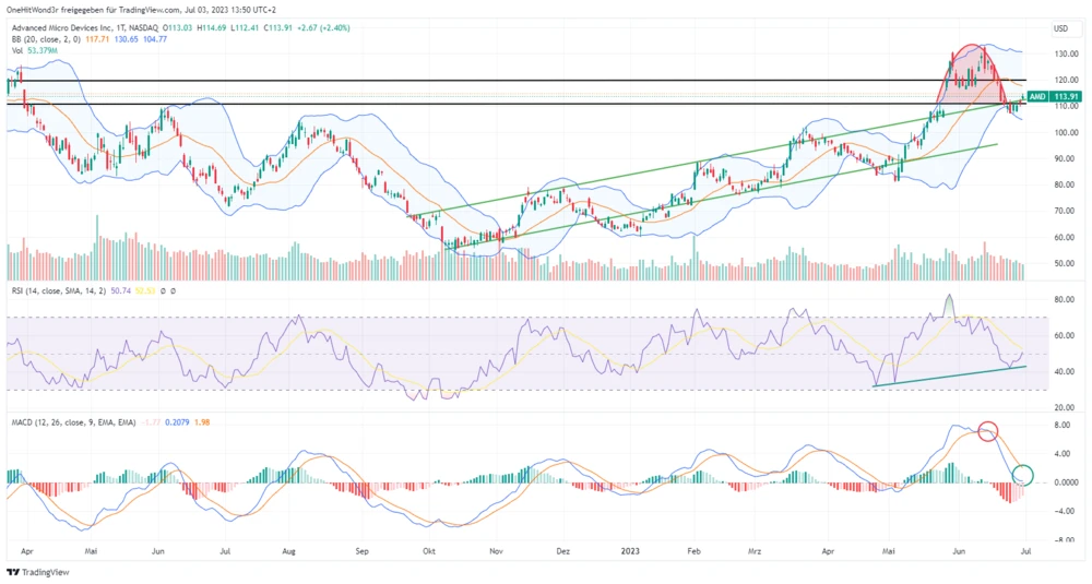 Für die kommenden Tage bedeutet das, dass die Aktie ihren Rebound fortsetzen dürfte. Das erste Kursziel hierfür ist der Horizontalwiderstand bei 120 Dollar, das nächste das Verlaufshoch bei 133 Dollar. Auf der Habenseite der Bullen steht, dass der RSI seinen Aufwärtstrend verteidigen konnte und der MACD nach dem Crossing eine Bodenbildung im Plus-Bereich andeutet. Trotz der jüngsten Kursschwäche spricht auch dieser Indikator dafür, dass AMD die Trendbeschleunigung Mitte Mai behaupten konnte.