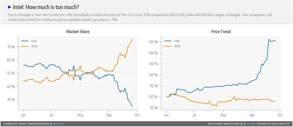 So haben sich beispielsweiße Intels Verzögerung der 10nm-Fertigung auch auf die 14nm-Fertigung ausgewirkt. Intel hat versucht, die Produktionsschwierigkeiten bereits ab September 2018 mit deutlichen Preissteigerungen auszugleichen. Eine Grafik des Reddit-User Ingebor zeigt deutlich, wie massiv Intel die CPU-Preise erhöhte und dadurch bei den Einzelverläufen gegenüber AMD deutlich Anteile verlor.