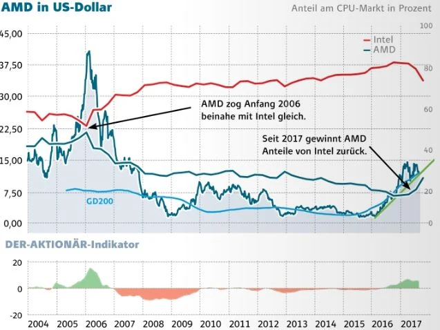 Doch das neue Flaggschiff von AMD namens Ryzen Threadripper schaffte das Unerwartete: Der Prozessor ist leistungsfähiger als Intels stärkster Chip.Damit holt AMD zum ersten Mal seit über zehn Jahren den technologischen Fortschritt Intels ein. Zum ersten Mal seit einem Jahrzehnt besteht damit die Möglichkeit, die Marktanteile, die AMD im Bereich der High-End-Prozessoren verloren hatte, zurückzuerobern. Gelingt das, könnte ein langfristiger Aufwärtstrend entstehen, der die Lebensdauer der aktuellen Prozessoren-Generation (bis zu sechs Jahren) erreicht. Denn im High-End-Bereich mit Preisen über 1.000 Euro lassen sich hohe Gewinnmargen ansetzen.