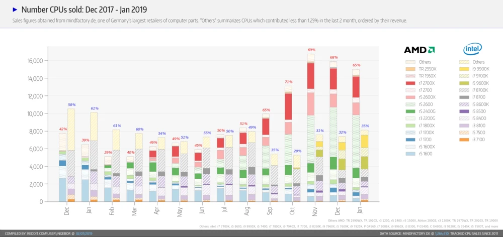 Die Chips kommen zudem beim Kunden gut an. AMD kann gegenüber dem Konkurrenten weiter Marktanteile gewinnen. Das zeigen sowohl Daten von Mercury Reseach als auch die von Reddit-User Ingebor aufbereiteten Daten des Großhändlers Mindfactory.
