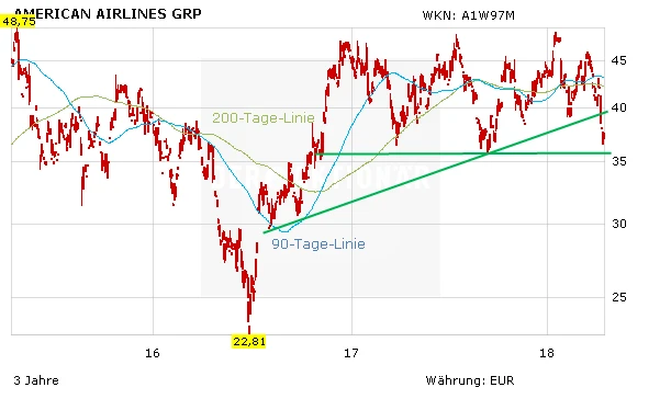 Da der Wert mittlerweile überverkauft ist, sollte die Talfahrt bald stoppen. Für eine nachhaltige Trendwende aufwärts müsste die American-Airlines-Aktie aber wieder über die 200-Tage-Linie steigen, die derzeit bei knapp 50,50 Dollar verläuft. Richtig freundlich wird das Chartbild dann über 53 Dollar.