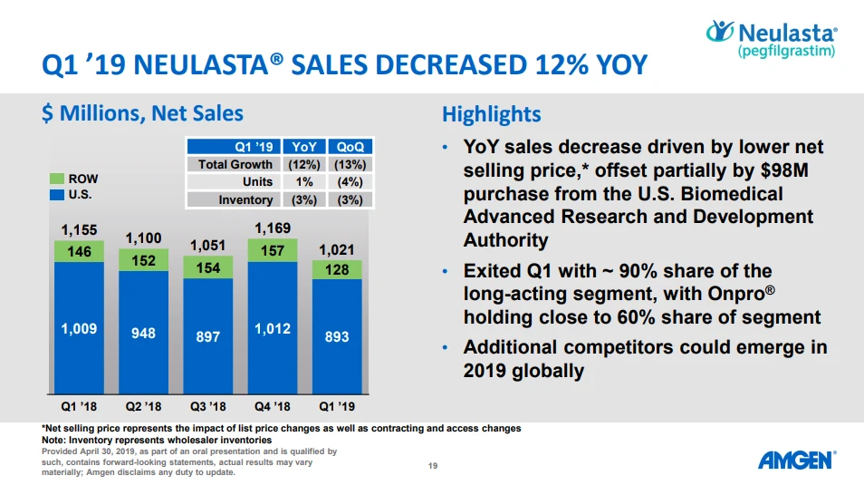 Zu den Verkaufsschlagern zählen die Immunverstärker Enbrel und Neulasta. Allerdings bekommt man hier zunehmend die Konkurrenz zu spüren, sodass die Umsätze nur noch verlangsamt zulegen.