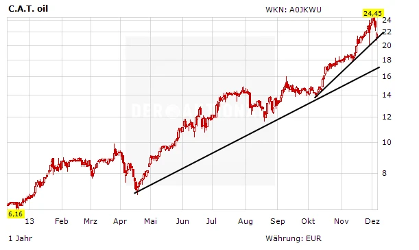 C.A.T. Oil zählte in den vergangenen Wochen zu den stärksten Werten auf dem deutschen Kurszettel. Ab Anfang Oktober legte der Wert zwischenzeitlich mehr als 40 Prozent an Wert zu und kletterte im Hoch bis auf 24,45 Euro. Nach einer so starken Kursrallye ist ein Rücksetzer alles andere als ungewöhnlich.