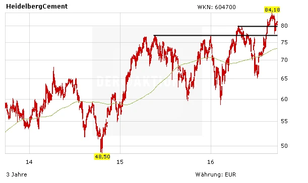 Denn die Experten vom Bankhaus Lampe beziffern das Kursziel für die Aktie von HeidelbergCement nun nicht mehr nur auf 90,00 Euro, sondern bereits auf 106,00 Euro. Analyst Marc Gabriel hat im Zuge der Übernahme von ItalCementi seine Prognose für den Gewinn je Aktie für 2017 um 20 Prozent auf 6,79 Euro angehoben. Für 2018 rechnet er sogar mit einem Ergebnis von 8,28 Euro pro Anteilschein.