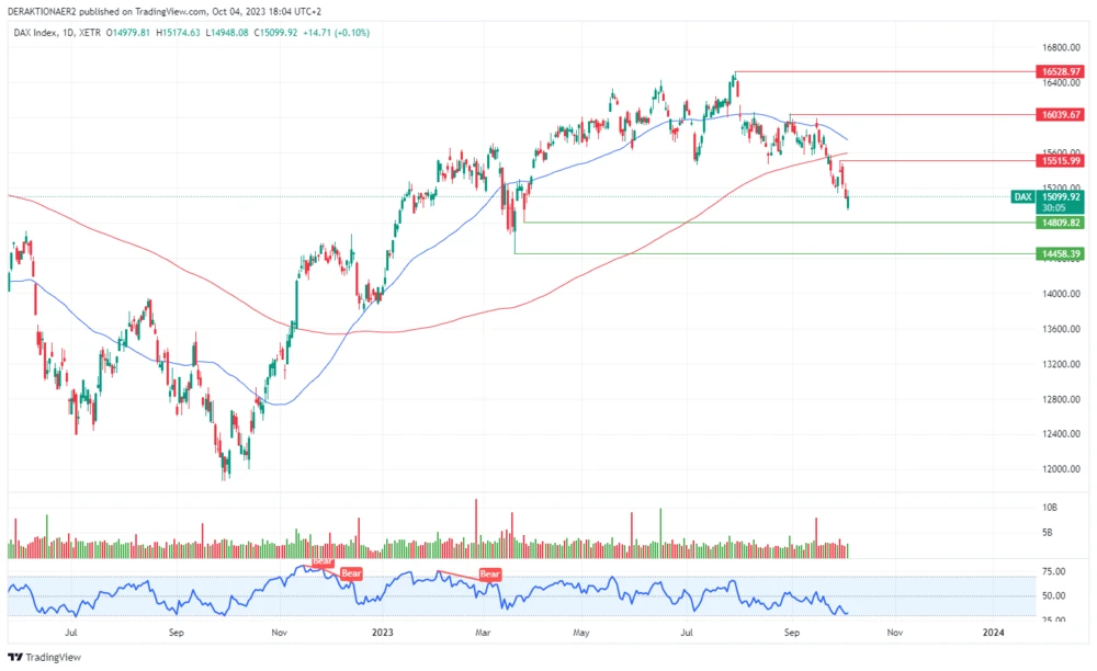 Der Dax war im frühen Handel erstmals seit März wieder unter die Marke von 15 000 Punkten gefallen, bevor er sich erholte und schließlich um 0,10 Prozent auf 15 099,92 Punkte zulegte.