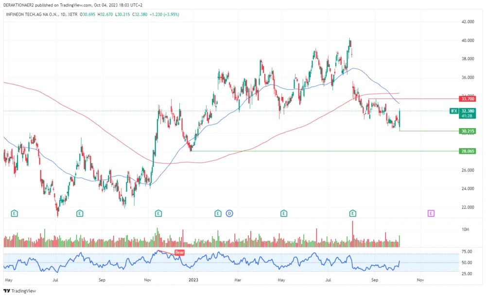 Die Aktien von Infineon haben am Mittwoch angezogen und damit von der Aussicht auf überraschend positive Geschäfte im Automobilsegment profitiert. Die Papiere des Chipherstellers setzen sich am Nachmittag mit einem Plus von 4,1 Prozent auf 32,43 Euro an die Spitze des Dax. Zudem sprangen sie über die 21-Tage-Durchschnittslinie, die unter Charttechnikern als Maß für die kurzfristige Entwicklung gilt. Der deutsche Leitindex gab leicht nach.