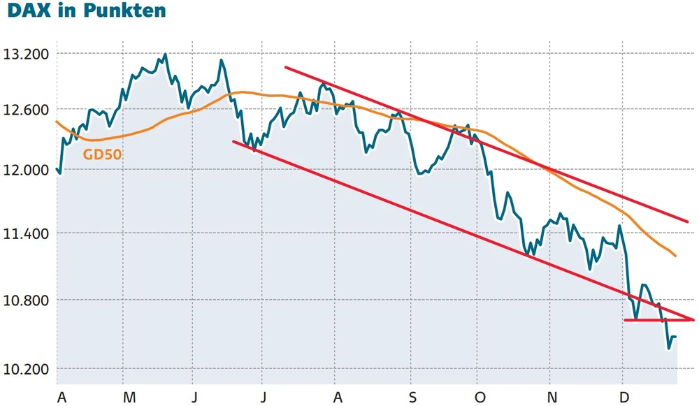 Der im Sommer eingeläutete Abwärtstrend ist weiter intakt. Es bedarf schon einem gewaltigen Anstieg, um sich Hoffnungen auf eine Trendwende machen zu können. Zunächst einmal müsste der DAX das Verlaufstief bei 10.622 zurückerobern, um die Chance auf einen Wiedereintritt in den Abwärtstrendkanal (siehe Chart) zu haben. Anschließend wäre bei 10.929 die nächste Hürde zu meistern.