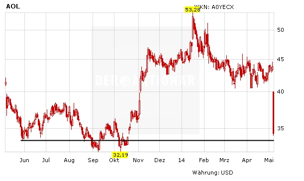 Im frühen New Yorker Handel rauscht die AOL-Aktie um über 18 Prozent in die Tiefe. Es wird gewiss noch eine Zeitlang dauern, bis die Börse den Schock mit den schlechten Zahlen verdaut hat. Bis sich die Lage nicht nachhaltig beruhigt hat, sollten Anleger die Aktie des Internet-Dinos tunlichst meiden.