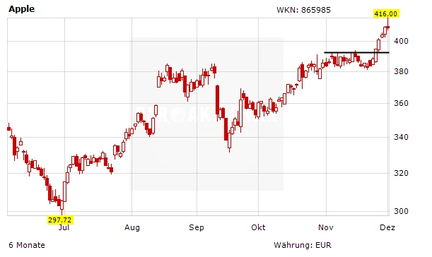 Lassen wir uns also überraschen, was Apple mit Topsy vorhat. Die Aktie lieferte indes zuletzt positive Überraschungen. Sie lieferte ein charttechnisches Kaufsignal und sprang zuletzt auch wieder über die Marke von 400 Euro. Sowohl von fundamentaler als auch charttechnischer Seite ist bei Apple mit weiteren Kurssteigerungen zu rechnen. Anleger können auf dem aktuellen Niveau zugreifen, sollten sich aber mit einem Stopp bei 335,00 Euro absichern.