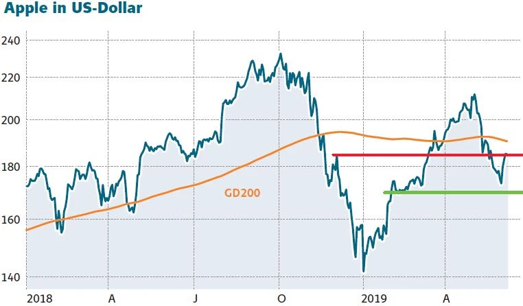 Die Aktie von Apple ist nach der jüngsten Korrektur und dem Rutsch unter die 200-Tage-Linie charttechnisch angeschlagen. Am Donnerstag konnte das Papier aber weitere Zugewinne verzeichnen. 1,5 Prozent ging es nach oben auf 185,22 Dollar. Eine Rückeroberung der 200-Tage-Linie wäre ein wichtiges positives Signal für die Aktie.