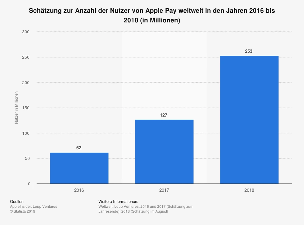Da Apple selber keine Angaben zu den Nutzerzahlen seines Service macht, liegen bislang nur Schätzungen dazu vor. So ging Loup Ventures im Jahr 2018 von rund 253 Millionen weltweiten Nutzern aus. Zum Vergleich: Paypal hatte Ende 2018 rund 267 Millionen aktive Accounts.