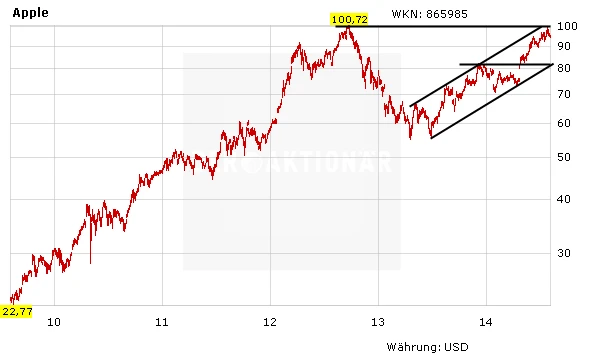 Die Aktie von Apple feiert schon seit Monaten. Die jüngste Konsolidierung an den Märkten kann dem Wert nahezu nichts anhaben. Seit Mitte April dieses Jahres geht es bei der Apple-Aktie wie an der Schnur gezogen nach oben. Und mittlerweile ist auch das vor zwei Jahren bei 100,72 Dollar markierte Allzeithoch nicht mehr weit entfernt. Gelingt auch der Sprung darüber, würde ein weiteres klares Kaufsignal generiert. Anleger bleiben in jedem Fall weiter mit einem Stopp bei 52 Euro engagiert.
