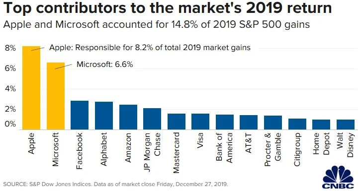 Apple hat unglaubliche 86,16 Prozent im vergangenen Jahr zugelegt und ist damit nicht nur der Jahressieger im Dow, sondern auch das wertvollste börsennotierte Unternehmen der Welt, wenn man von dem kürzlich an die Börse gegangenen, saudischen Ölgiganten Aramco absieht.
