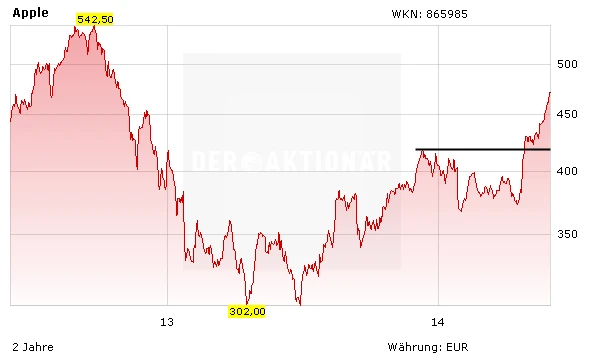 Auch DER AKTIONÄR bleibt weiterhin optimistisch, was die Entwicklung der Apple-Aktie angeht. Das Kursziel des AKTIONÄR liegt bei 750 Dollar oder umgerechnet 550 Euro. Der Stopp zur Absicherung sollte auf 355 Euro nachgezogen werden.