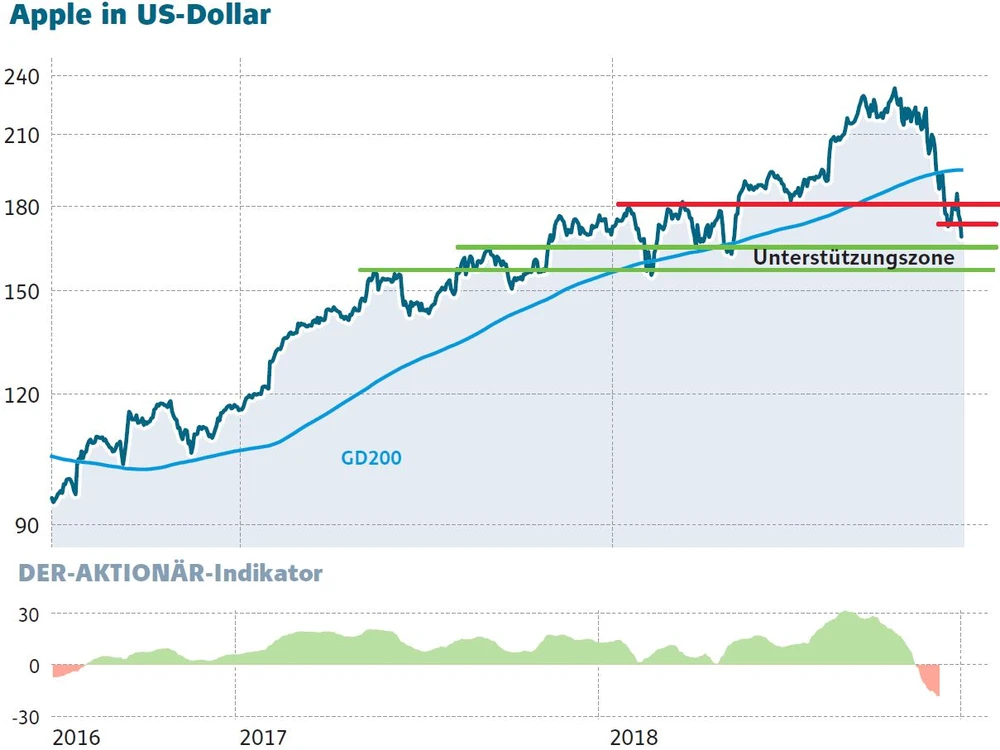 Derzeit scheinen die Investoren vor allem auf eines zu warten: die nächsten Hiobsbotschaften von Apple oder einem Zulieferer. Für positive Nachrichten scheint sich niemand zu erwärmen. Oder man traut sich einfach nicht in das fallende Messer, was Apple aktuell ja ist, zu greifen. Doch manche müssen vielleicht zugreifen – Leerverkäufer. Zwar haben Shortseller jetzt Oberwasser, aber mittlerweile sind sämtliche Analysten, die vor wenigen Wochen noch optimistisch waren umgeschwenkt, haben die Erwartungen gekappt und die Aktie ist um rund 30 Prozent gefallen. Mit anderen Worten, es ist schon vieles an Negativem im Kurs eingepreist.