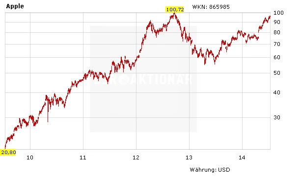 Die Aktie von Apple läuft seit Monaten nahezu nur in eine Richtung: in die nach oben. DER AKTIONÄR ist ebenfalls optimistisch, was die weitere Entwicklung des Titels angeht. Es dürfte nur eine Frage der Zeit sein, bis die Marke von 100 Dollar überwunden werden kann und ein neues Allzeithoch markiert wird. Die bisherige Rekordmarke lag bei 100,72 Dollar und wurde im September 2012 markiert. Rückenwind könnte das Papier insbesondere vom neuen iPhone 6 erhalten, dessen volle Produktion demnächst anläuft. DER AKTIONÄR sieht das Kursziel weiterhin bei 128 Doller oder umgerechnet 94 Euro. Zur Absicherung sollte ein Stopp bei 52 Euro platziert werden.