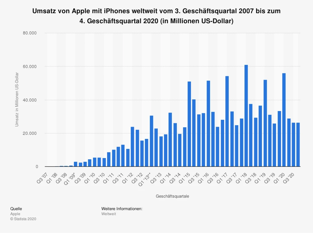 Präsentation und Verkaufsstart des iPhone 12 fielen wegen Corona-bedingter Verzögerungen diesmal erst in den Oktober – und damit bereits in das erste Quartal des Geschäftsjahrs 2021 von Apple. Pünktlich zu wichtigen Weihnachtsgeschäft sind jedoch alle vier Modelle auf dem Markt. DER AKTIONÄR rechnet daher lediglich mit einer Verschiebung der entsprechenden Umsätze auf das Folgequartal.
