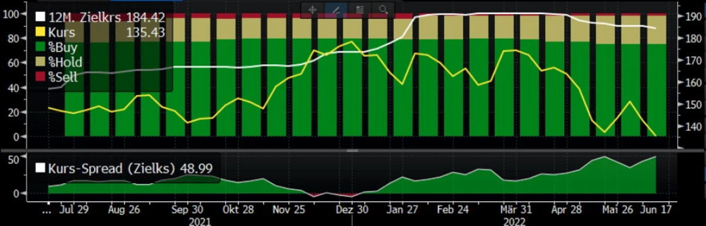 Die Aktie hat auch den niedrigsten Anteil an Kaufempfehlungen seit mehr als einem Jahr. Aktuell empfehlen nur noch 36 von 48 Experten die Apple-Papiere zum Kauf. Das durchschnittliche Kursziel ging ebenfalls etwas zurück – und zwar auf zuletzt 184,42 Dollar, was ausgehend vom Mittwochsschluss einem Kurspotenzial von 36 Prozent entspricht.
