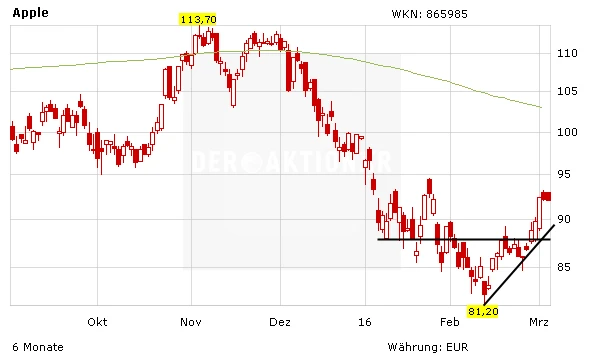 Das Bild der Apple-Aktie hat sich zuletzt etwas verbessert. In den letzten zwei Tagen legte der Kurs um vier Prozent zu. Es ist allerdings noch zu früh, um von einer Trendwende zu sprechen. Trader können  bei einem Bruch des Widerstandes bei 101,50 Dollar mit engem Stopp einsteigen.